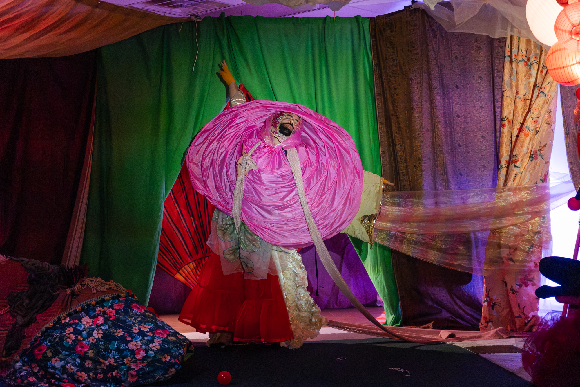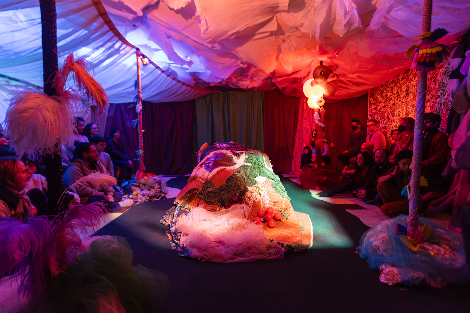A radial play with spokes pointing outward. Or an explosion of spores in the form of an evening at the theater. It is a pageant that gives a micro view of the forest floor. It has to do with awe and decadence and the question: "What knows it's alive?"